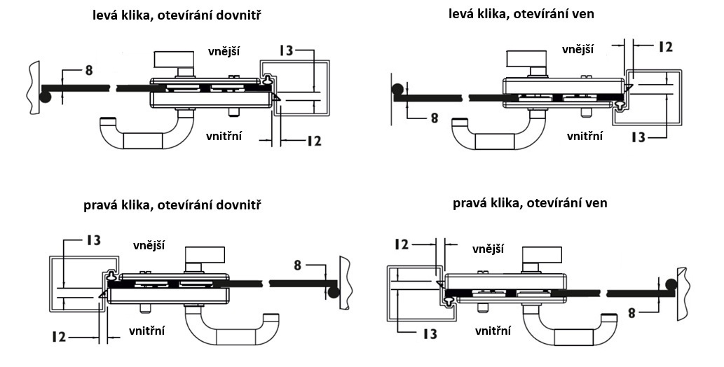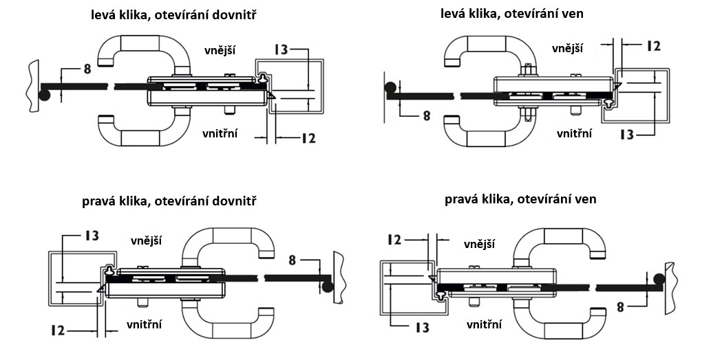 Orientace zámku (u provedení WC (v CM), KPZL a KPZR) je určena umístěním závěsů při pohledu ze strany, kam se dveře otevírají: